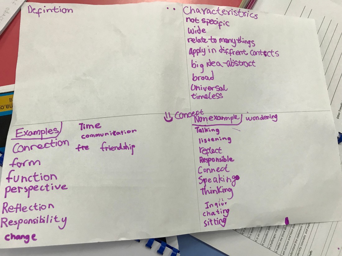 Working on a Frayer model about concepts In the last post I wrote about the first week or so of our PYPx process, where the students chose a United Nations Sustainable Development Goal and the part of the transdisciplinary theme, Sharing the planet, to focus on. They had written me an email with their chosen … Continue reading A Journey through the PYP Exhibition (part 2)